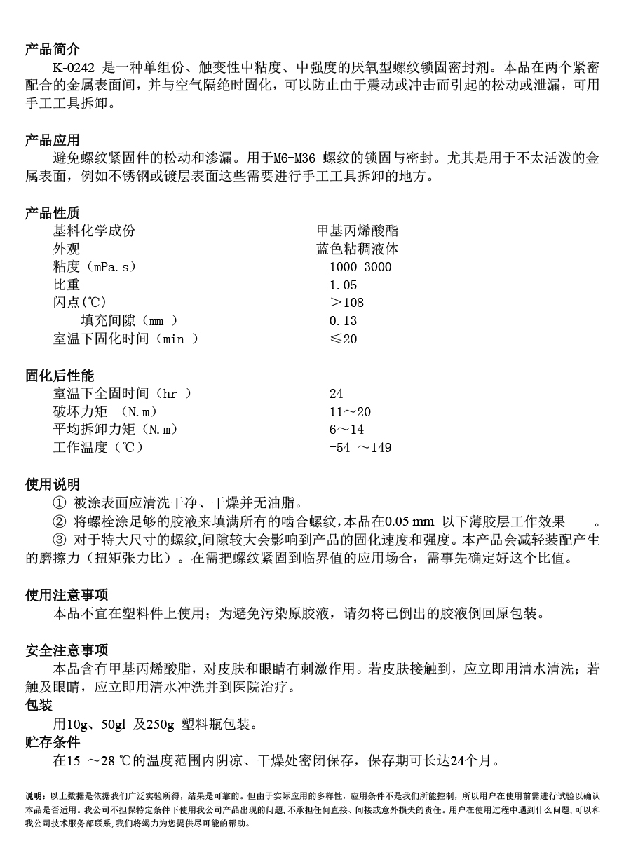 K-0242中強(qiáng)度螺紋鎖固密封劑